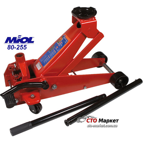 Домкрат гидравлический подкатной Миол (80-255) грузоподъемностью 3,5 т оснащен педалью, обеспечивающей быстрый подъем (холостой ход) контактного седла под основание автомобиля. Площадь седла увеличена. Используется при проведении работ, требующих подъема автомобиля и других грузов, при выполнении монтажных и ремонтных работ.