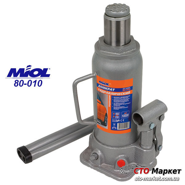 Домкрат гидравлический телескопический 2 т, 181-345 мм Миол (80-010) используется для подъема автомобилей и др. грузов при выполнении ремонтных и монтажных работ. Оснащен ручным приводом плунжера, обеспечивающего плавный ход при небольшом рабочем усилии. Внутри штока расположен компенсирующий винт. В домкрате применяется слабо подверженное сжатию специальное масло (индустриальное АИ)