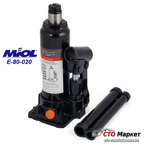 E-80-020) используется при подъеме автомобиля и различных грузов во время проведения ремонтных и монтажных работ. Наличие ручного привода плунжера делает плавный ход при маленьком рабочем усилии. Компенсирующий винт находится внутри штока. При работе домкрата используется слабо подверженное сжатию специальное масло (индустриальное АИ).