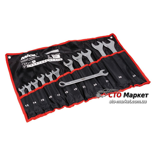 Ключи комбинированные ТМ Миол (51-714) изготовлены способом горячей ковки. Материал сталь, легированная хромом и ванадием, а также термически упрочнены. Твердость ключей — 45–51 HRС. Набор ключей поставляется в брезентовую сумку из капроновой прочной ткани. В сумке имеются отверстия для того, чтобы была возможность подвесить на стене в мастерской или СТО.