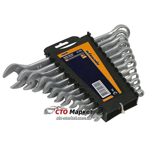Набор ключей рожково-накидных с 6 по 22 фирма производитель Miol (Код 51-713) всего 15 шт. изготовлен из хром-ванадиевой стали, покрытие сатин, твердость 44–51 HRC. Имеет двенадцатигранный динамический профиль с увеличенной площадью контакта, что уменьшает деформацию при больших нагрузках. Применяется для профессиональной работы с резьбовыми соединениями. Набор размещен на планшете.