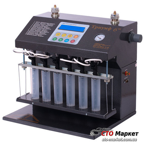 SVauto™ Триумф 6М предназначен для работы одновременно с 6 форсунками. Функционал и возможности полностью идентичны со стендом Триумф 6 за исключением наличия дополнительного бачка для проверочной жидкости (керосина). Так же в управлением стенда добавлены электронные клапана, которые переключают подачу жидкость из того или иного бачка. Производитель рекомендует придерживаться очередности выполнения режимов проверки и чистки, так как электроникой предусмотрены переходные режимы для продувки топливных магистралей стенда при переключении чистящего бачка на проверочный и обратно.